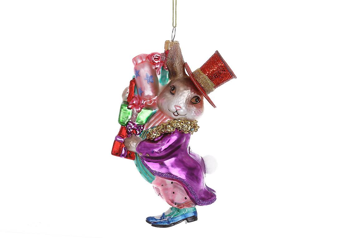 Ялинкова фігурна прикраса зі скла Кролик з подарунками 13.5см