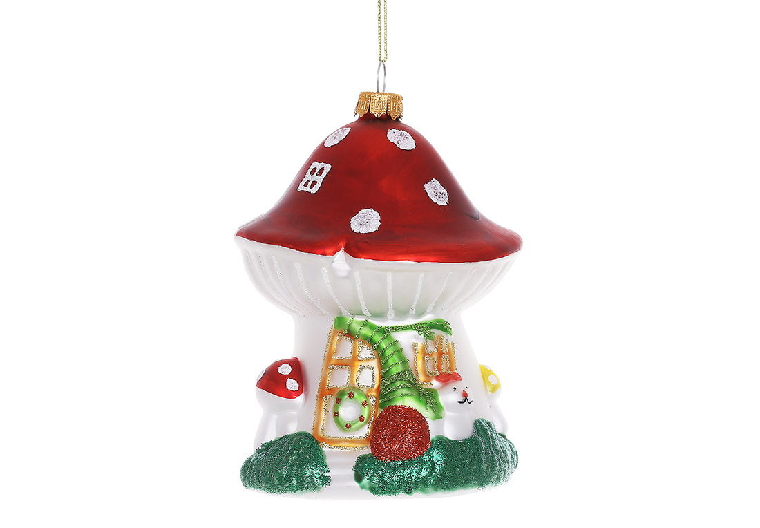 Ялинкова фігурна прикраса зі скла Мухомор-будиночок 13см