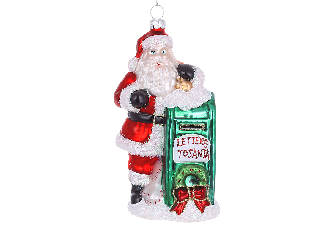 Ялинкова фігурна прикраса зі скла Санта з поштовою скринькою 14см