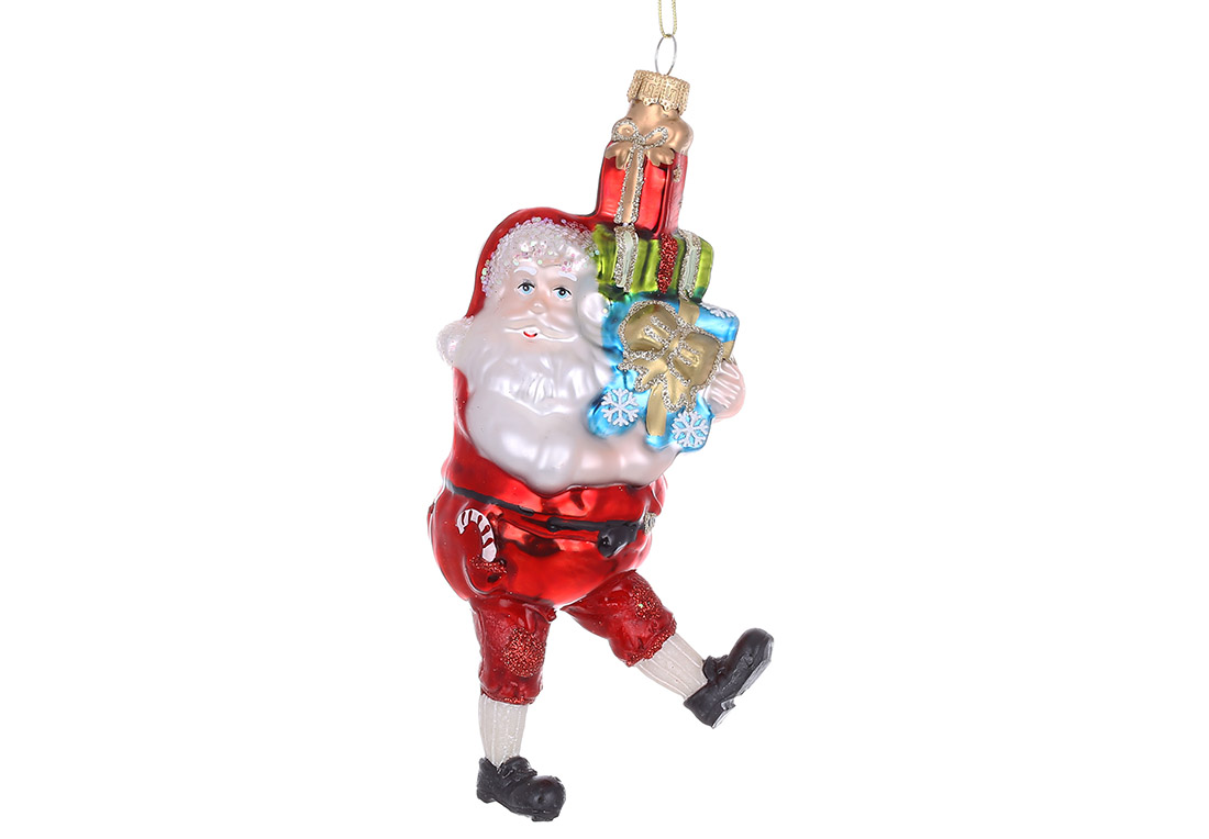 Ялинкова фігурна прикраса зі скла Санта з подарунками 18см