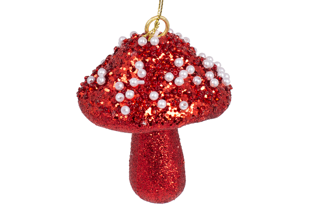 Ялинкова прикраса Гриб 8см з декором з білих намистин, колір - червоний