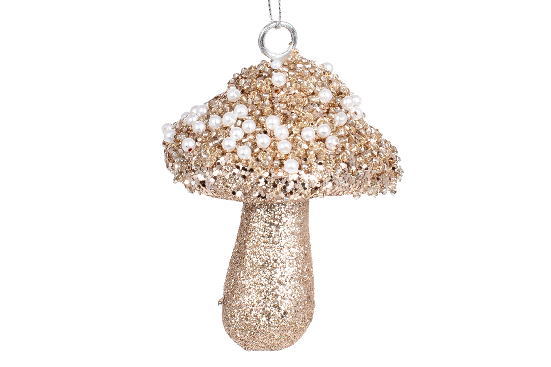 Ялинкова прикраса Гриб 8см з декором з білих намистин, колір - шампань