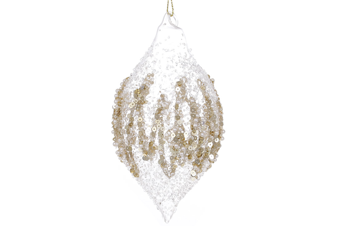 Ялинкова прикраса з прозорого скла з покриттям "лід" та декором з бісеру та паєток 14см