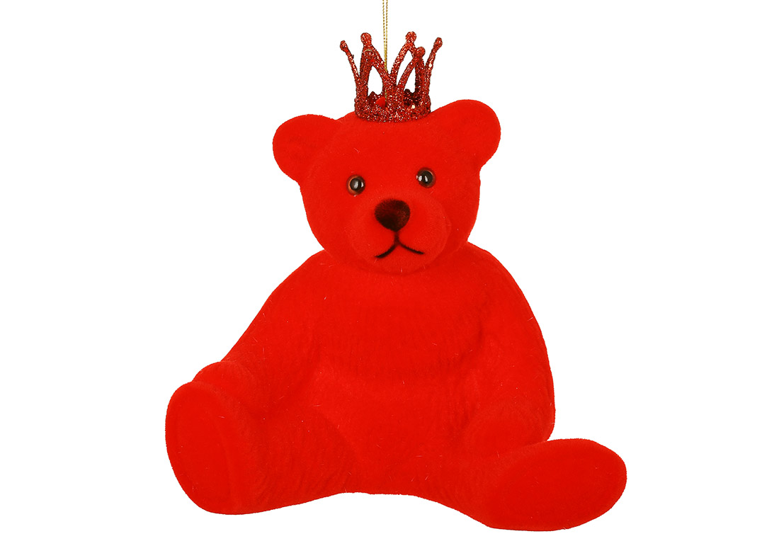 Ялинкова прикраса Ведмедик з короною з флоковим напиленням, 20см, колір - червоний
