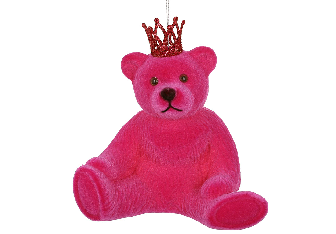 Ялинкова прикраса Ведмедик з короною з флоковим напиленням, 20см, колір - маджента