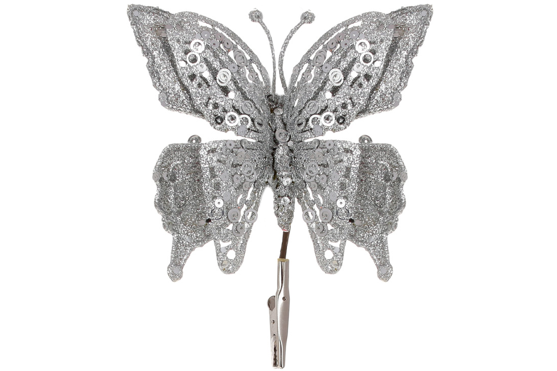 Ялинкова прикраса на кліпсі Метелик, 17см, колір - срібний гліттер