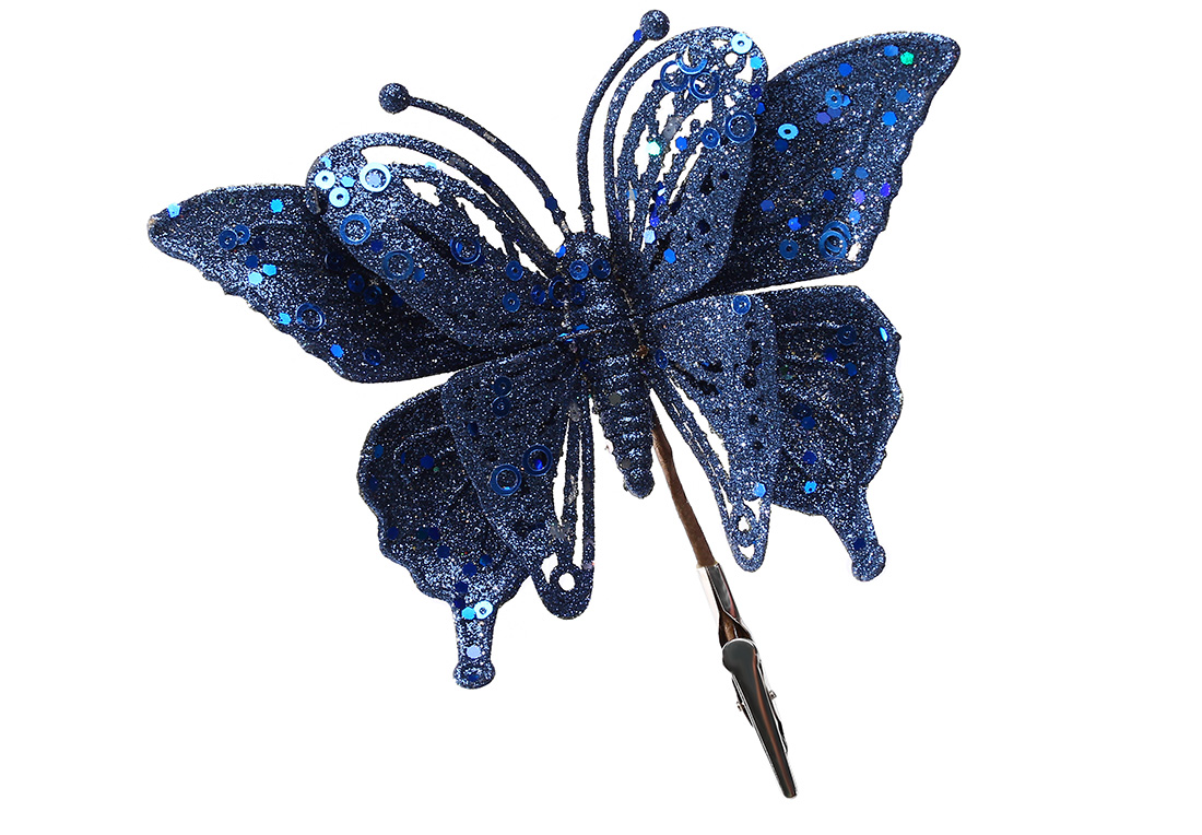 Ялинкова прикраса на кліпсі Метелик, 17 см, колір - синій гліттер
