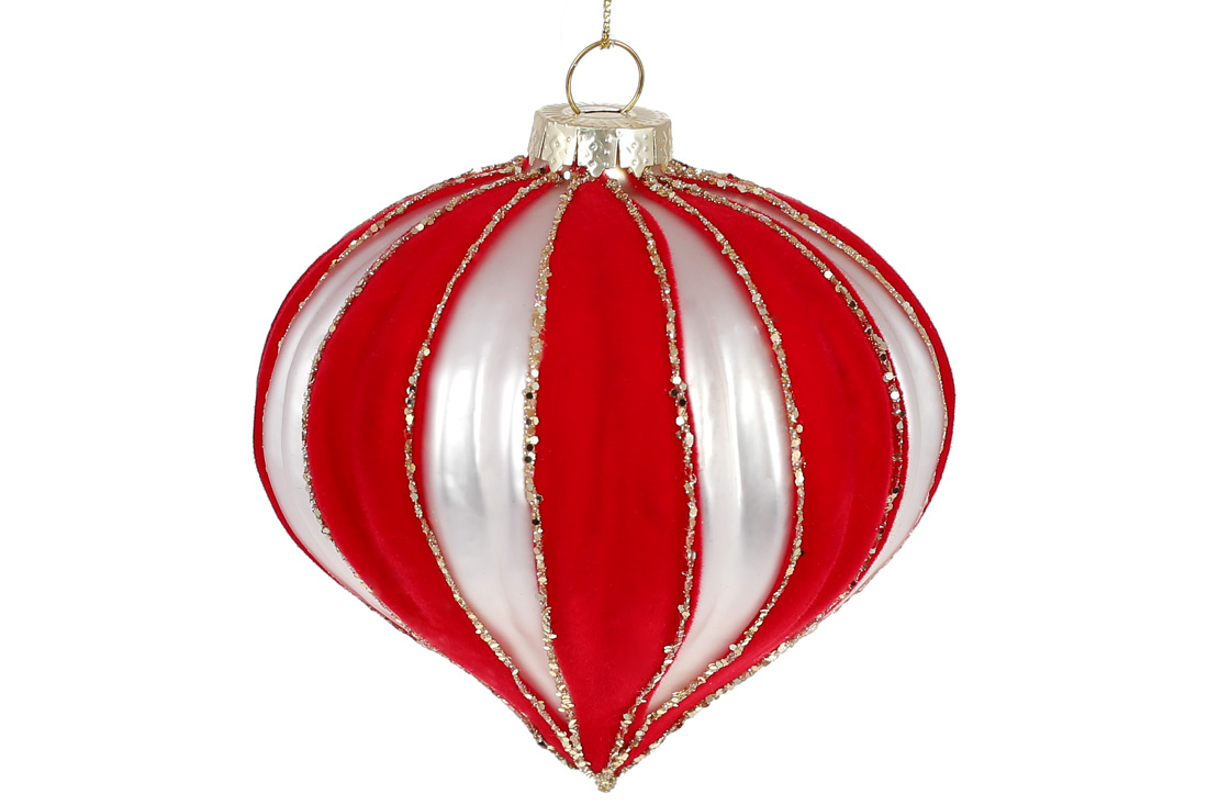 Ялинкова прикраса рельєфної форми з декором з оксамиту 10см, колір - червоний з білим перловим