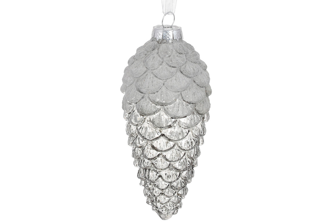 Ялинкова прикраса Шишка з декором із гліттера 14см, колір - сріблястий лід