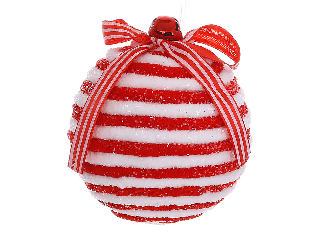 Ялинкова плюшева куля з дзвіночком, посипана гліттером 8см, колір - червоний з білим
