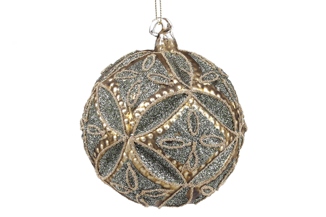 Ялинкова куля 10см рельєфної форми з декором з гліттера, колір - старовинне золото