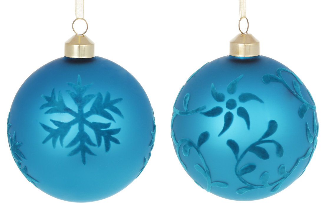 Ялинкова куля 10см з оксамитовим орнаментом Сніжинки, колір - матовий аквамарин, 2 дизайни в дисплей коробці
