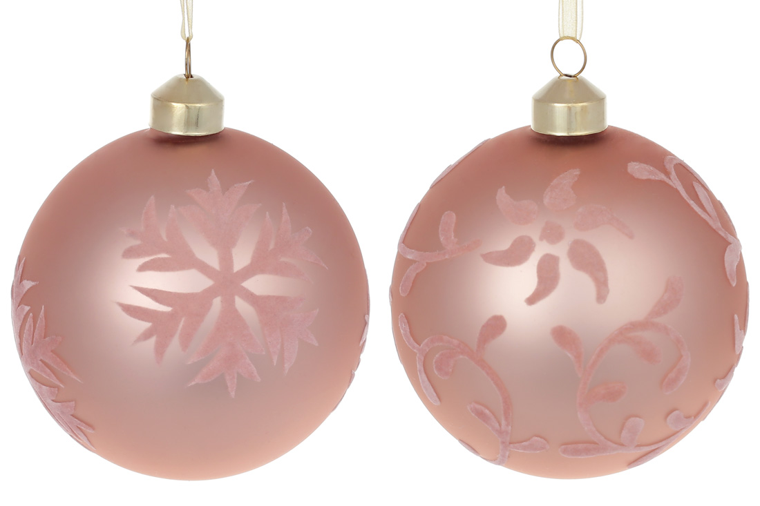 Ялинкова куля 10см з оксамитовим орнаментом Сніжинки, колір - рожевий, 2 дизайни в дисплей коробці