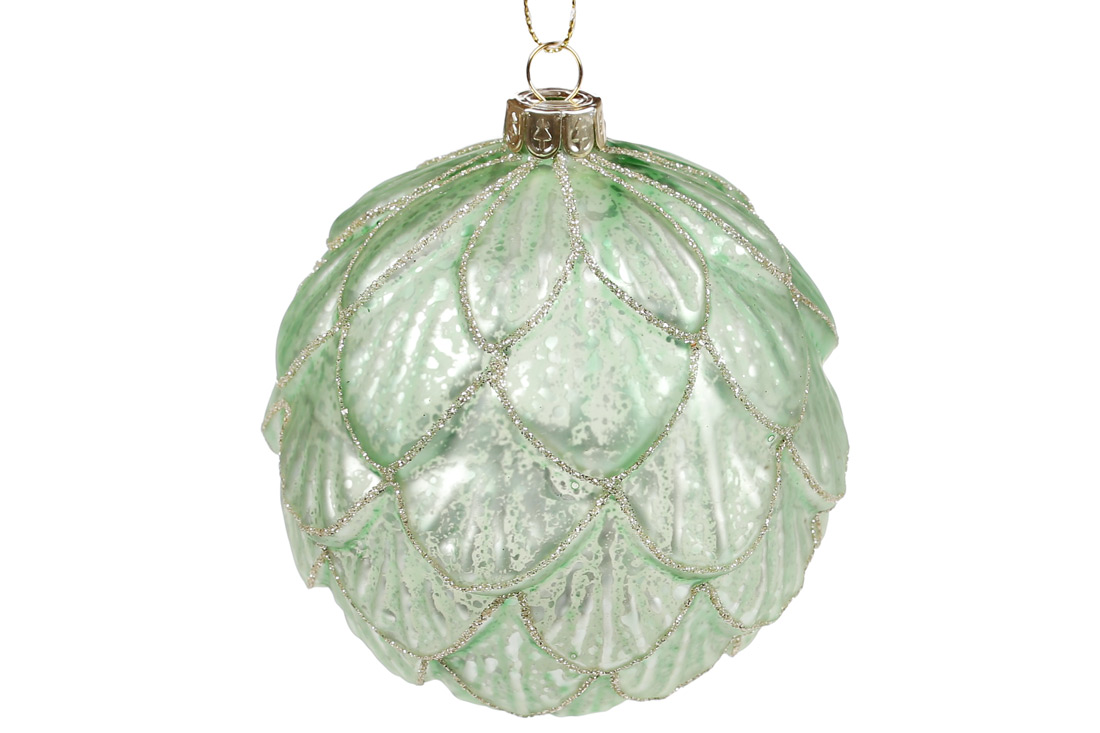 Ялинкова куля 10см з рельєфним візерунком та декором з гліттера, колір -трав'яний зелений