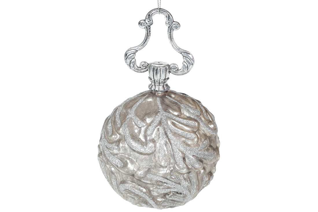 Ялинкова куля 12см на фігурному підвісі з рельєфним орнаментом, колір - срібло