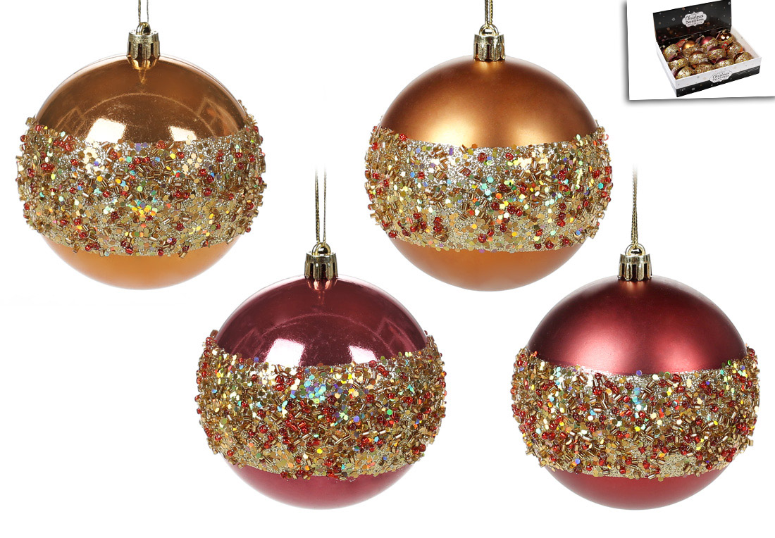 Ялинкова куля 8см, колір бордо, охра із золотою присипкою, мікс 4 дизайни в дисплей коробці