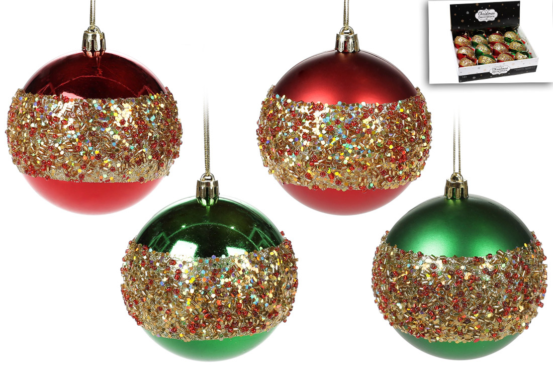 Ялинкова куля 8см, колір - червоний і зелений із золотою присипкою, мікс 4 дизайнів в дисплей коробці