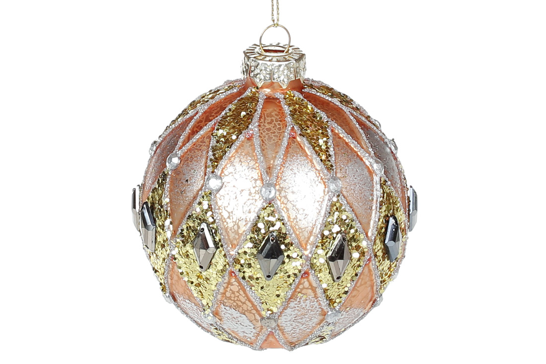 Ялинкова куля 8см на фігурному підвісі з декором з гліттера та бусин, колір - беж антик із золотом