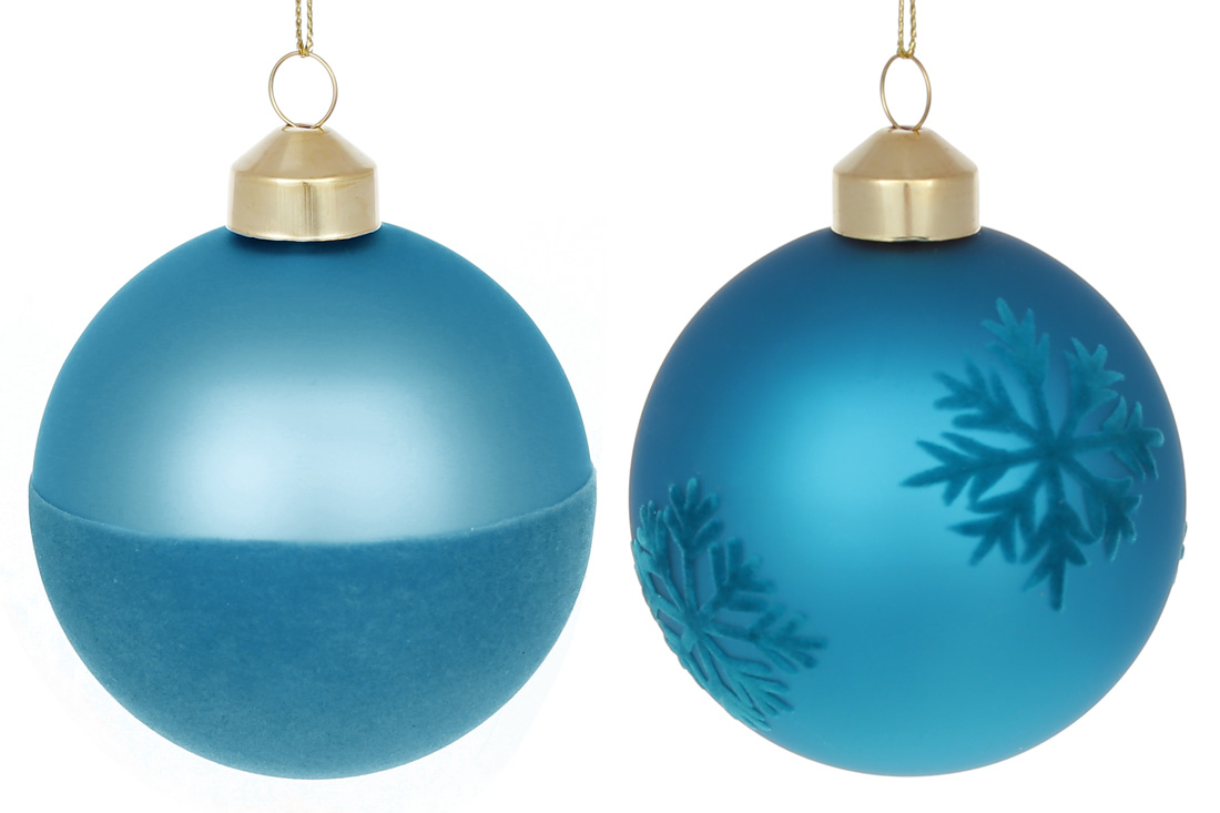 Ялинкова куля 8см з оксамитовим орнаментом, колір - матовий аквамарин, 2 дизайни в дисплей коробці