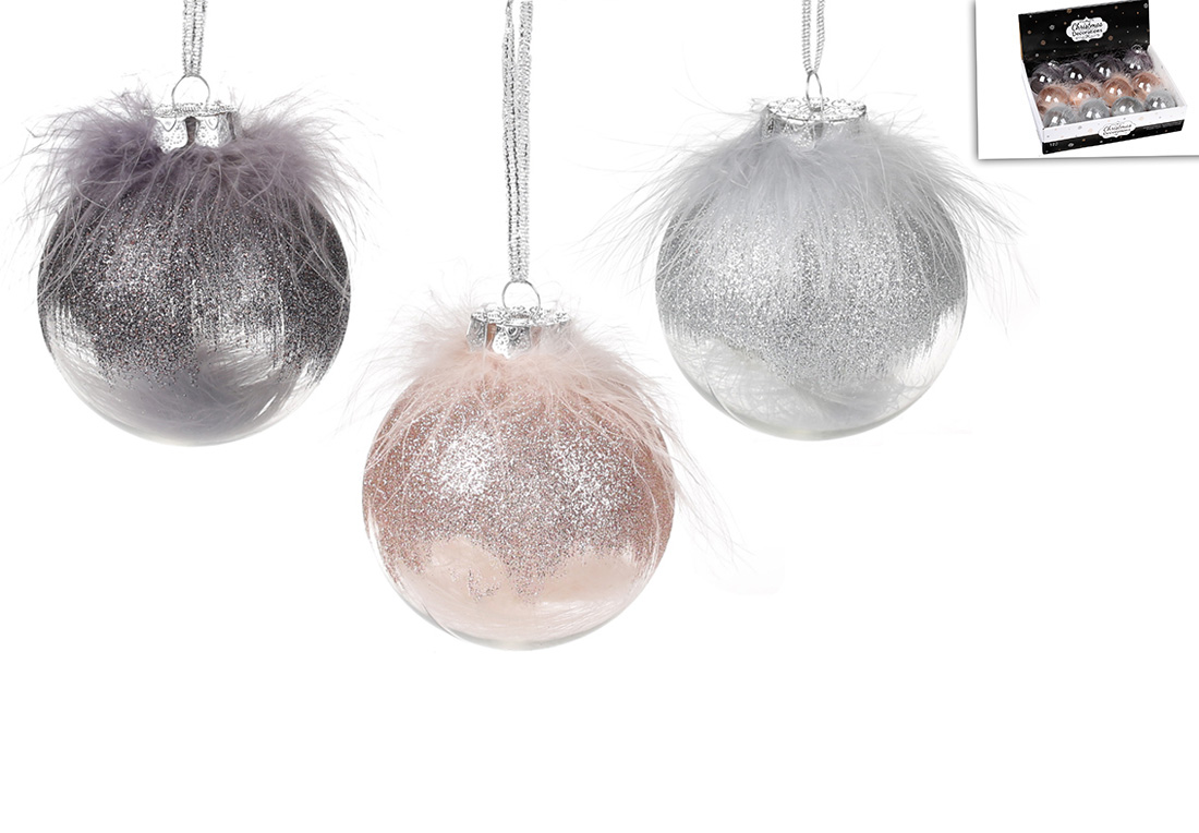 Ялинкова куля 8см з декором з пуху, мікс 3-х кольорів в дисплей коробці: рожевий пудровий, світло-сірий, графітовий сірий