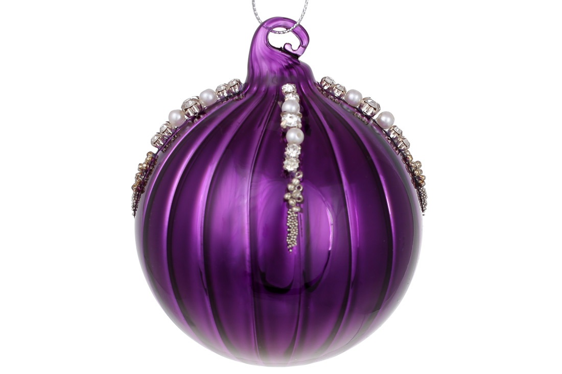 Ялинкова куля 8см з декором зі страз та бусин, колір - фіолетовий