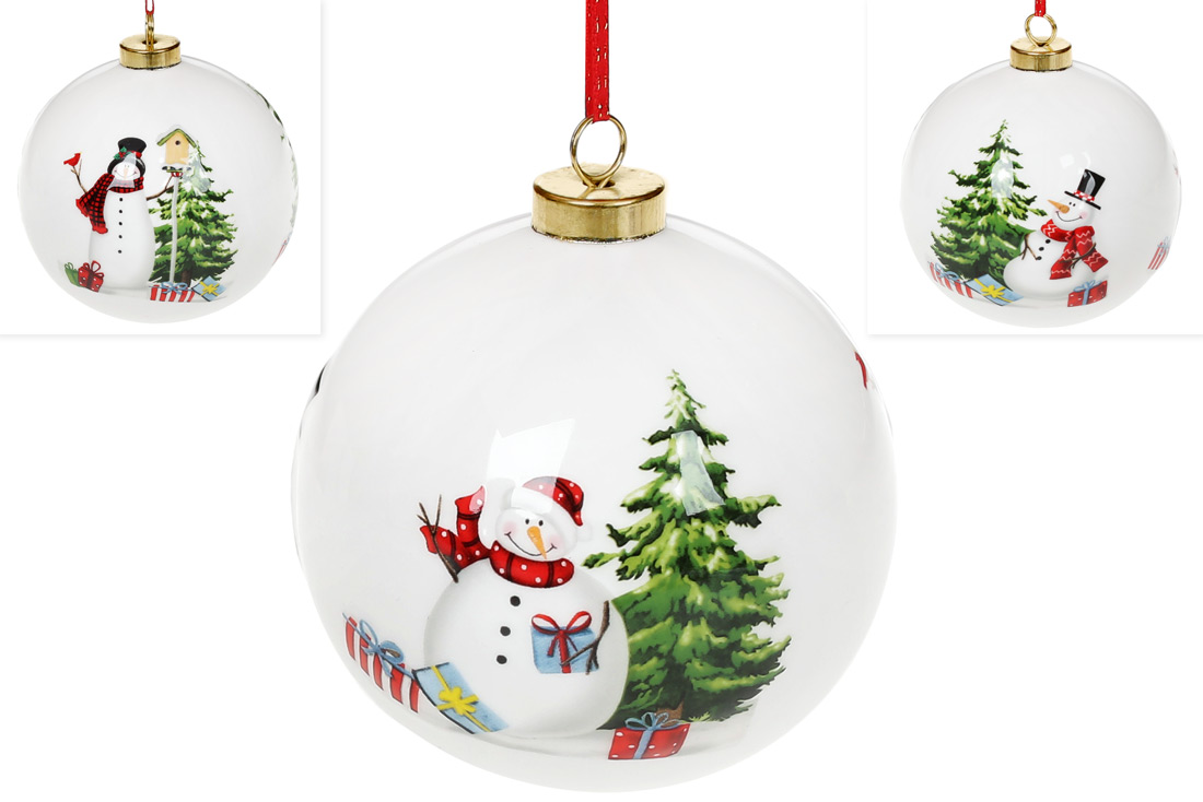 Ялинкова куля з кераміки з тристороннім малюнком Веселі сніговики, 10см, колір - білий
