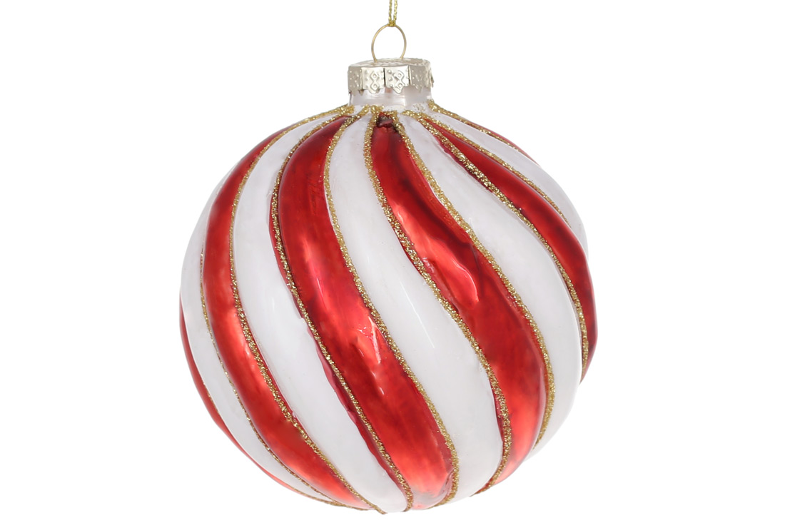 Ялинкова куля рельєфної форми 10см з декором з гліттера, колір - червоно-білий