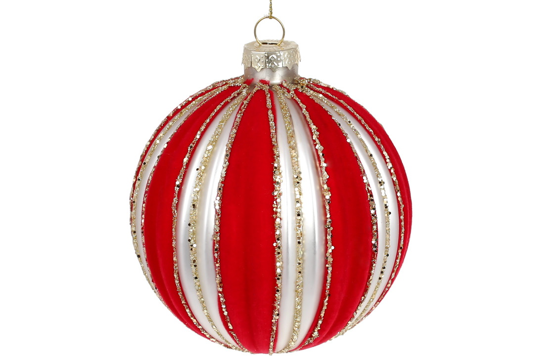 Ялинкова куля рельєфної форми з декором з оксамиту 10см, колір - червоний з білим перловим