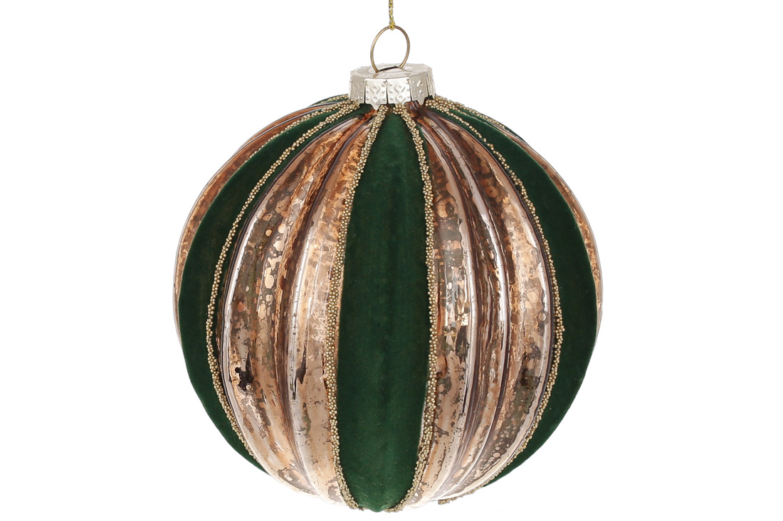 Ялинкова куля рельєфної форми з декором з оксамиту 10см, колір - темно-зелений з античним золотом