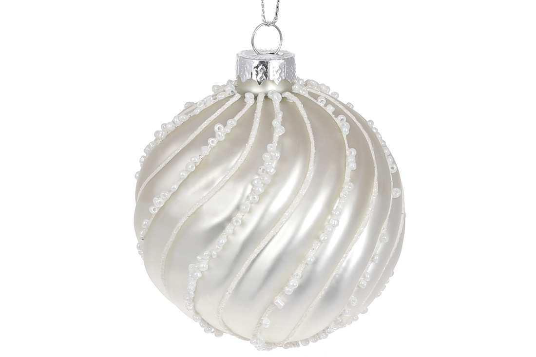 Ялинкова куля рельєфної форми з декором з бісеру 8см, колір - перлинний білий