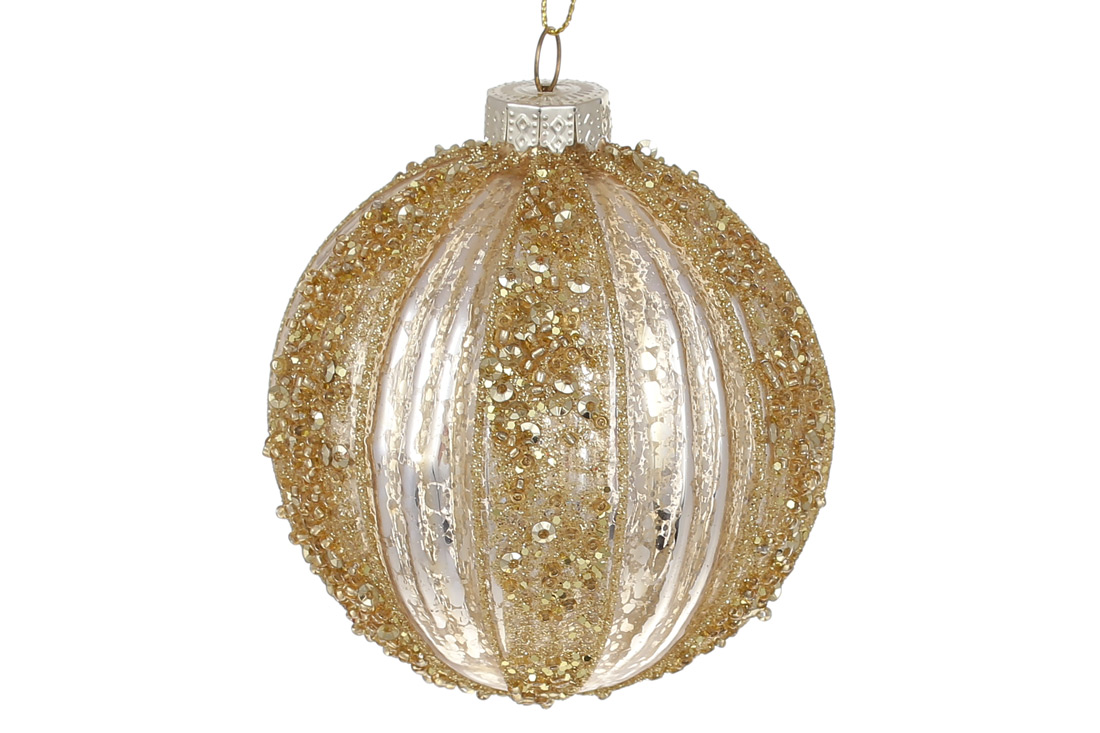 Ялинкова куля рельєфної форми з декором з гліттера та паєток 8см, колір - світле золото