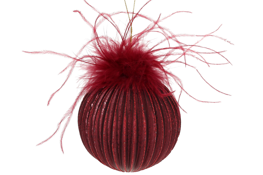 Ялинкова куля рельєфної форми з декором з пір'я та гліттера 10см, колір - бордовий