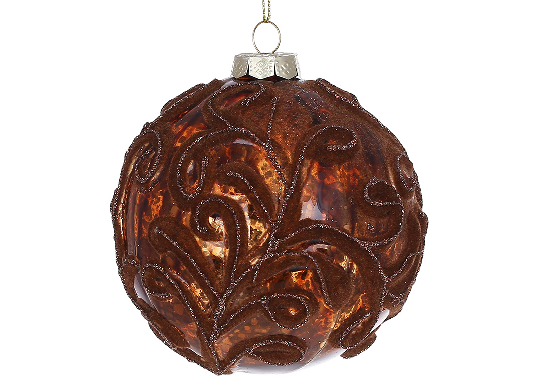 Ялинкова куля з флористичним візерунком з оксамиту та гліттера 10см, колір - коричневий антик