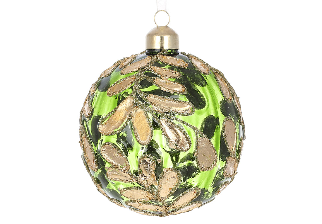 Ялинкова куля з флористичним візерунком оздоблена паталлю 10см, колір - зелений із золотом