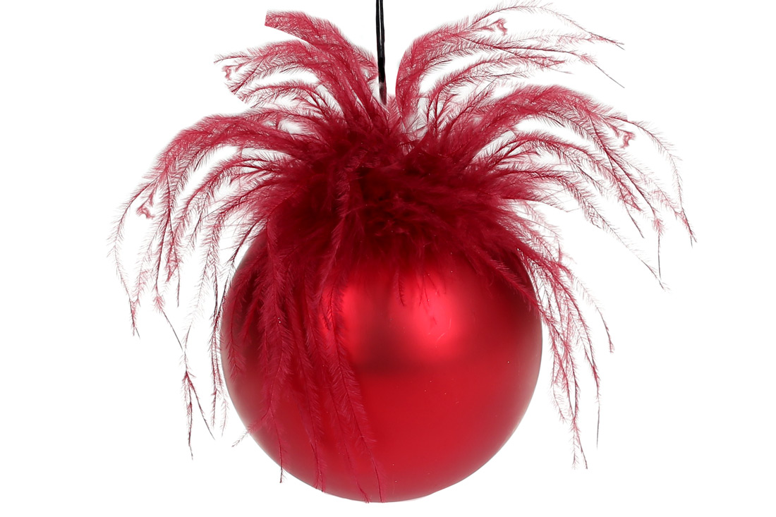 Ялинкова куля з матовим покриттям та декором з пір'я, 10см, колір - червоний
