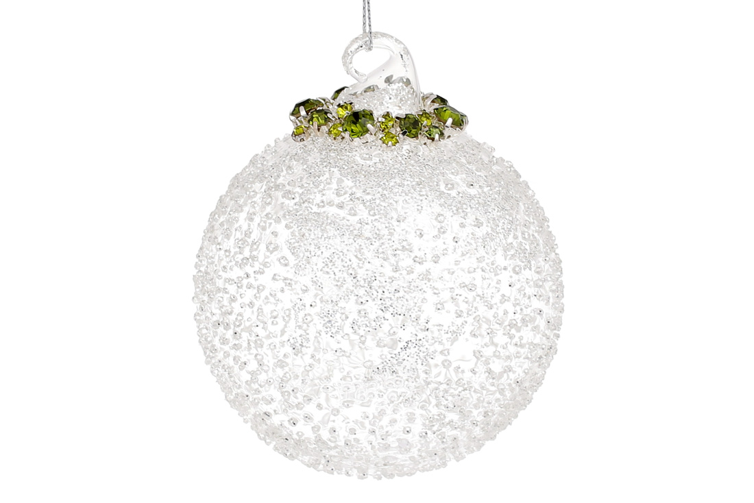 Ялинкова куля з покриттям лід і срібним гліттером, з декором із смарагдового каміння, 8см