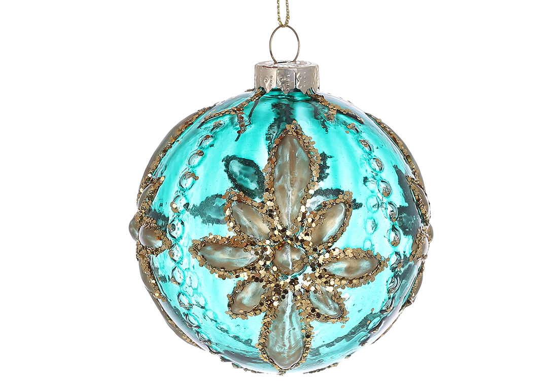 Ялинкова куля з рельєфним оранментом 8см, колір - смарагдовий із золотим гліттером