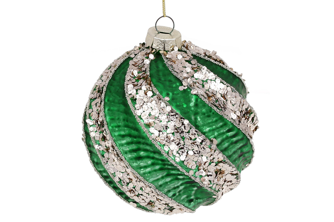 Ялинкова куля з рельєфом та декором з гліттера, 10см, колір - класичний зелений