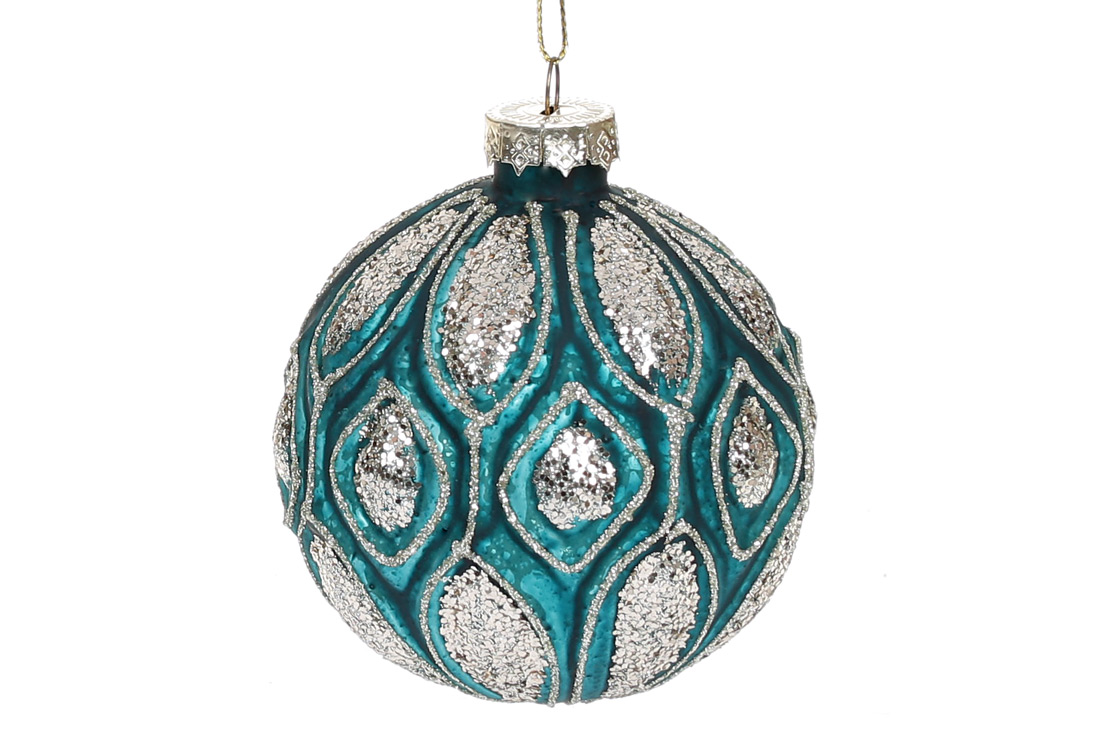 Ялинкова куля з рельєфом та декором з гліттера, 8см, колір - темна бірюза
