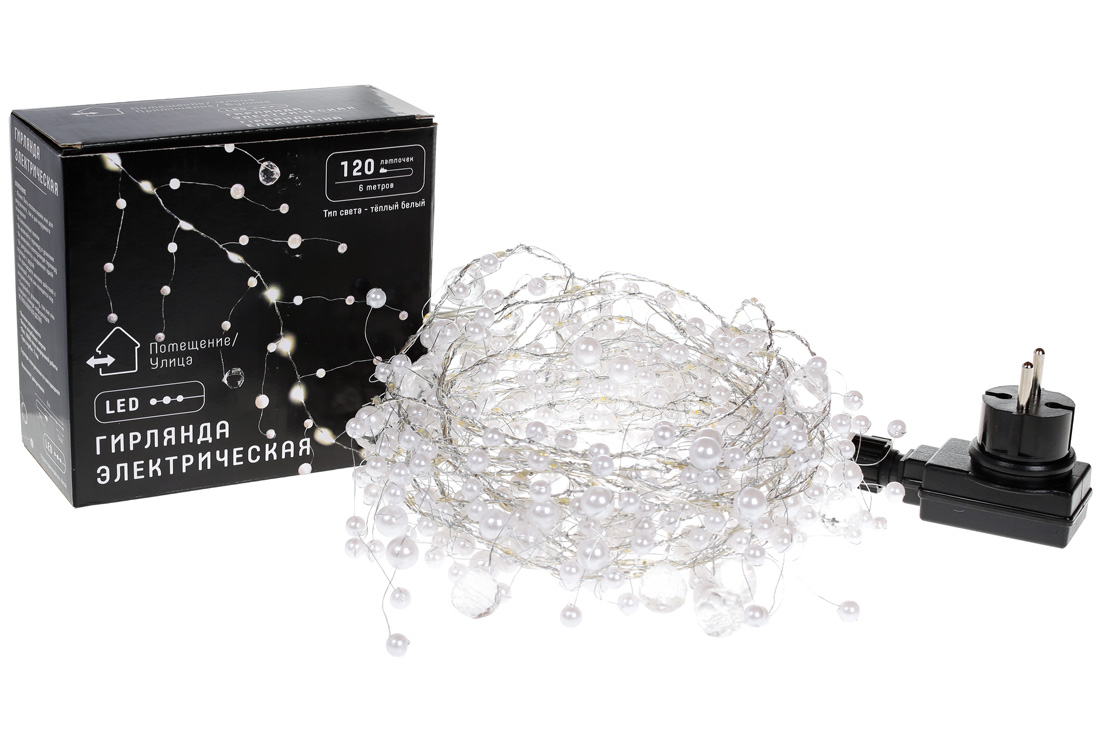 Гірлянда 120 міні-LED з декором з перламутрових бусин, 1 лінія, 6 метрів, колір лампочок - теплий білий, колір дроту - сріблястий, постійне свічення