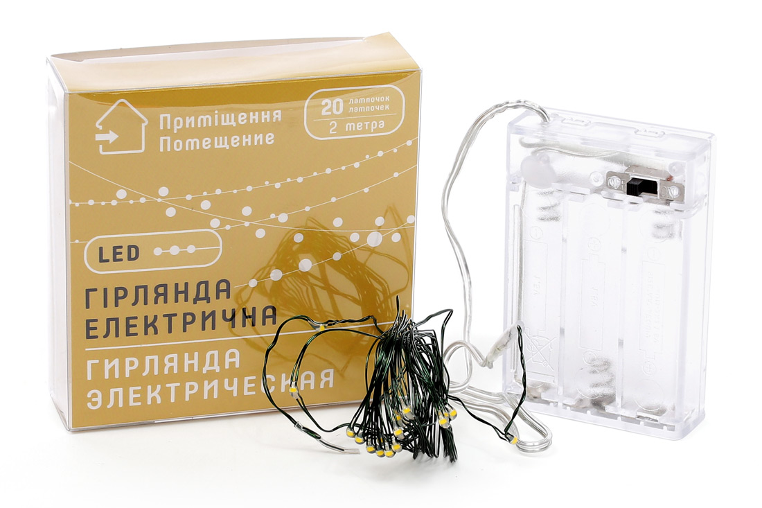 Гірлянда 20 міні-LED: 1 лінія 2 метри, 20 діодів/ нитка, колір - теплий білий, постійне світіння, адаптер на 3AA батарейках, колір дроту - зелений