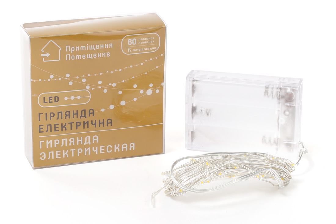 Гірлянда 60 міні-LED: 1 лінія 6 метрів, 60 діодів/ нитка, колір - теплий білий, постійне світіння, адаптер на 3AA батарейках
