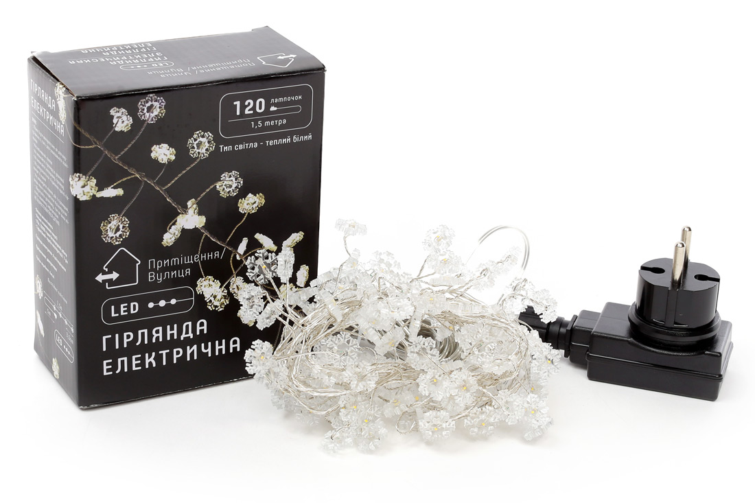 Гірлянда-кластер 120 міні-LED: 1 лінія 1,5 метра, з декором на лампочку "Сніжинка", колір - теплий білий, постійне свічення