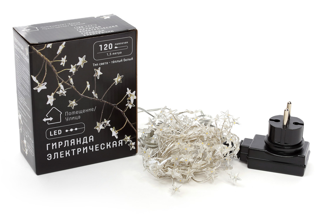 Гірлянда-кластер 120 міні-LED: 1 лінія 1,5 метра, з декором на лампочку "Зірка", колір - теплий білий, постійне свічення