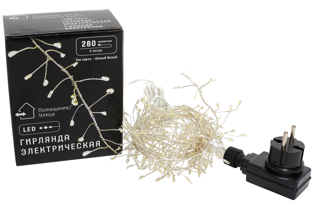 Гірлянда-кластер 280 міні-LED, 1 лінія, 2 метри, колір лампочок - теплий білий, колір дроту - сріблястий, постійне свічення
