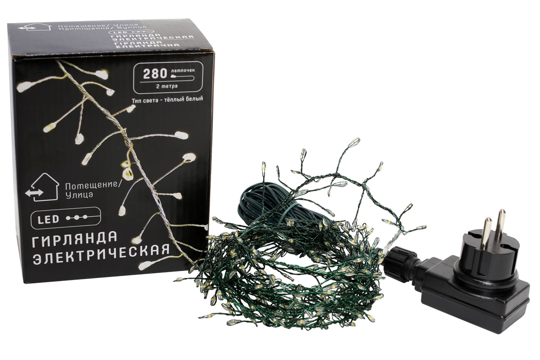 Гірлянда-кластер 280 міні-LED, 1 лінія, 2 метри, колір лампочок - теплий білий, колір дроту - зелений, постійне свічення