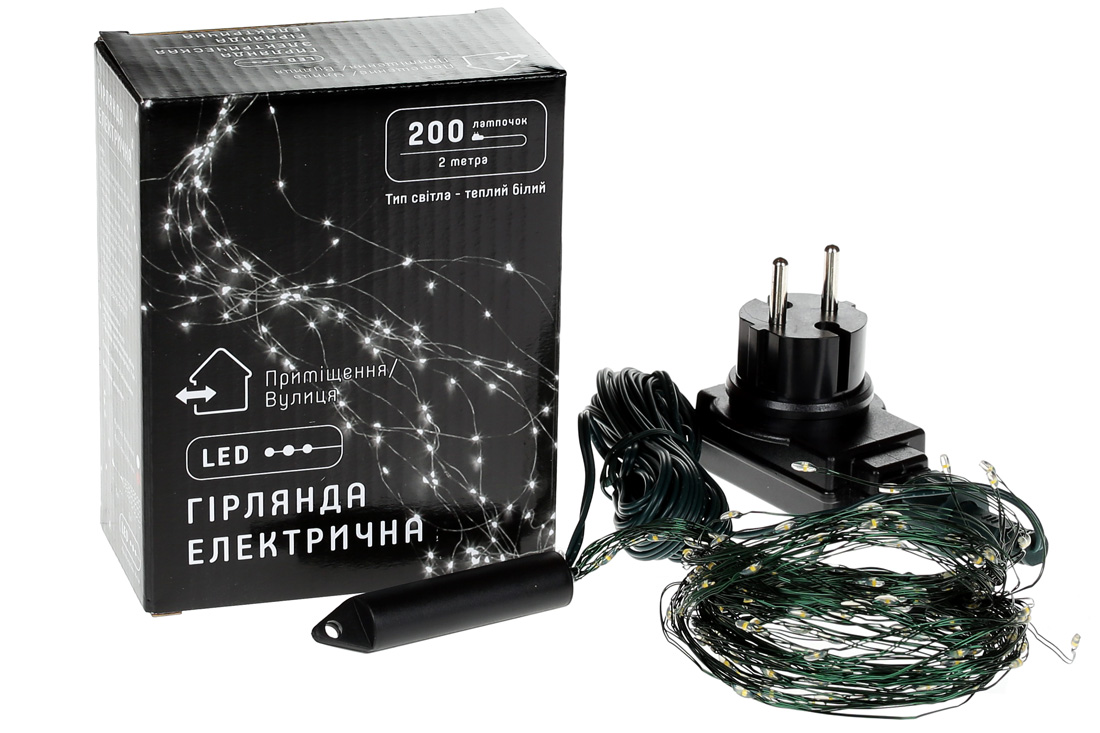 Гірлянда-пучок 200 міні-LED: 10 ліній по 2 метр, 20 діодів/ нитка, колір лампочок - теплий білий, колір дроту - зелений, з функцією миготіння (кожна 4