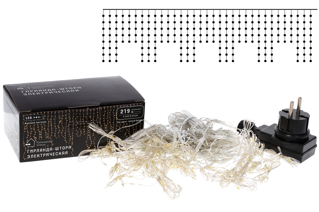 Гірлянда-завіса, 219 міні-LED: ширина – 3,2м, 18 ліній по 80см, 15 ліній по 50см. Колір – теплий білий, з функцією миготіння.
