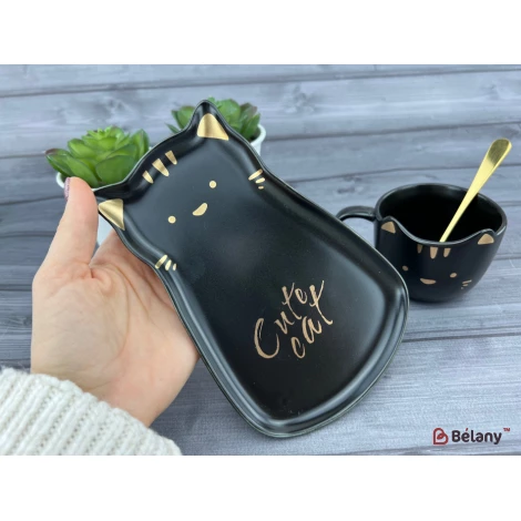 Cana Si Farfuria Din Ceramica "miau" Neagra