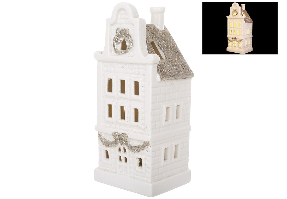 Керамічний Дім з LED підсвічуванням, 8*7*19.5см, колір - білий з гліттером шампань